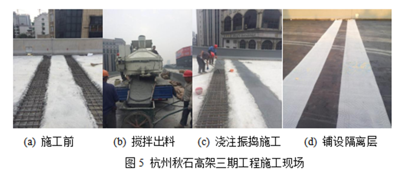 2014年11月,杭州秋石高架三期工程1、3、4标段的桥面连续结构,普通混凝土材料的桥面连续结构由于材料本身的缺陷,在运营初期就会产生裂缝并导致整体结构耐久性较差,维修养护成本高。因此在本工程中在满足变形及行车疲劳荷载要求的基础上,有效解决了连续构造的开裂破坏问题和耐久性问题,提高了桥梁的使用寿命。