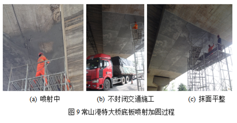 2014年11月,完成了杭金衢高速公路衢州段常山港特大桥的桥面底板的加固工程。考虑到原有贴钢板加固方案对主体结构有损伤,贴FRP的粘胶老化会导致耐久问题,在不中断交通的条件下,对已受损桥梁底板进行了耐久性喷射修复,实际修复面积约600m2,喷射厚度20毫米,避免了原有裂缝进一步变宽的趋势,有效分散了拉应力,并可同时提升结构抗碳化性能。