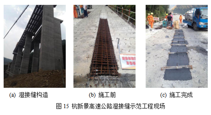 2014年9月,完成了杭新景高速公路第七标段湿接缝构造的示范应用工程。现场试验证明:在相同约束条件下,PVA纤维自身控裂能力,可解决目前普遍存在的桥梁湿接缝混凝土干缩裂缝问题,且可同时满足结构力学性能和耐久性需求,施工简便。有效解决了湿接头构造的开裂问题。